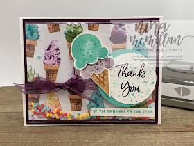 I used a Thick Basic White cardbase cut 5-1/2 x 8-1/2, scored at 4-1/4, then added a Blackberry Bliss layer measuring 4 x 5-1/4. I adhered the shaker element to this layer, then wrapped some of the Blackberry Bliss ribbon around it before attaching to the cardbase. I punched a 2-1/4" Coastal Cabana circle and 2" Basic White that I stamped my sentiment on. I added the ice cream cone I had stamped and punched to finish off the card.